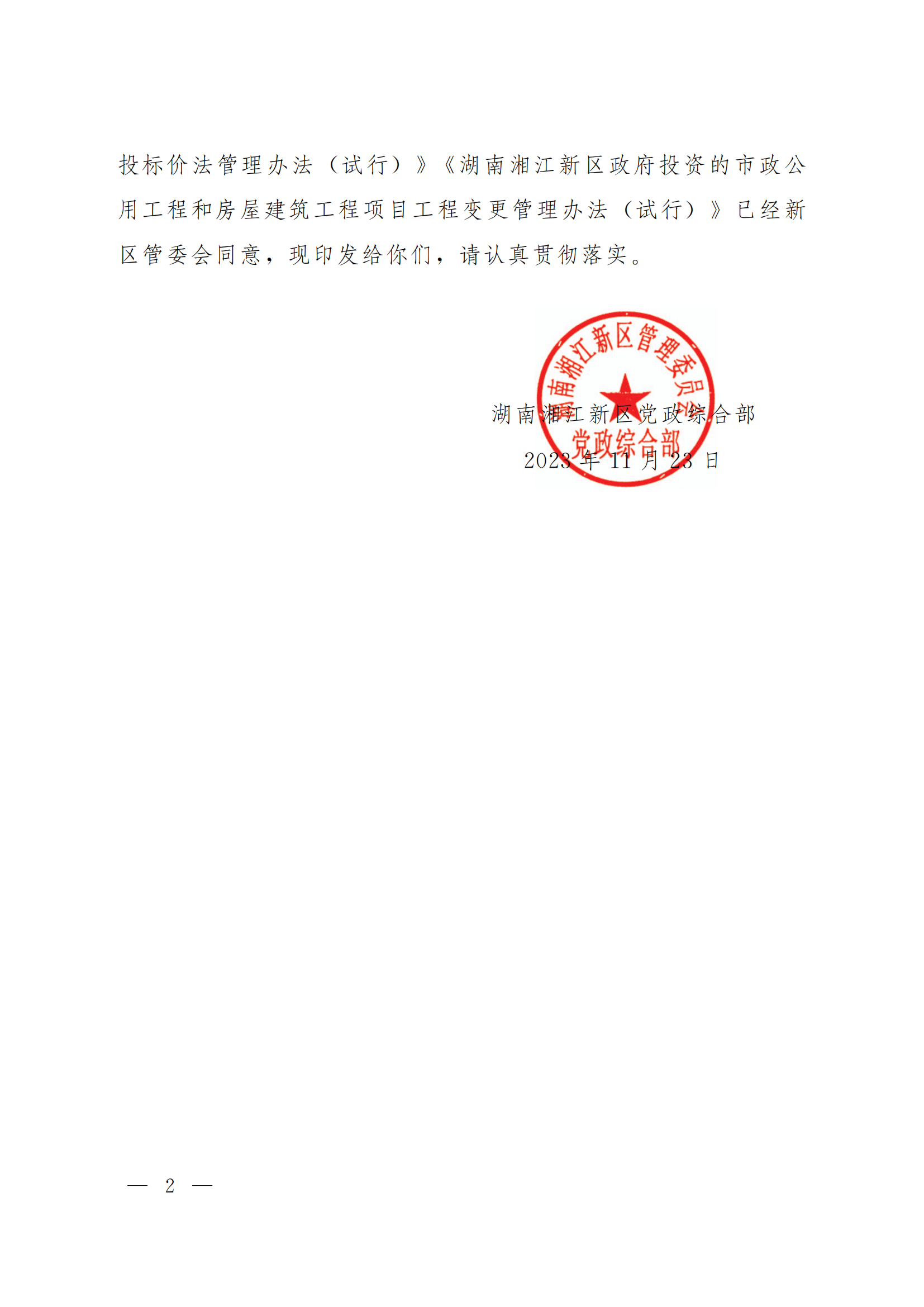 湖南湘江新區黨政綜合部關于印發《湖南湘江新區政府投資建設項目設計優化管理辦法(試行)》《湖南湘江新區政府投資建設項目招標投標經評審的最低投標價法管理辦法(試行)》《湖南湘江新區政府投資市政公用工程和房屋建筑工程項目工程變更管理辦法(試行)》的通知
