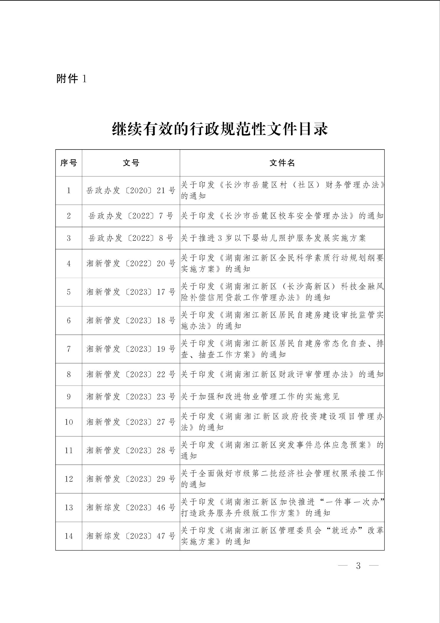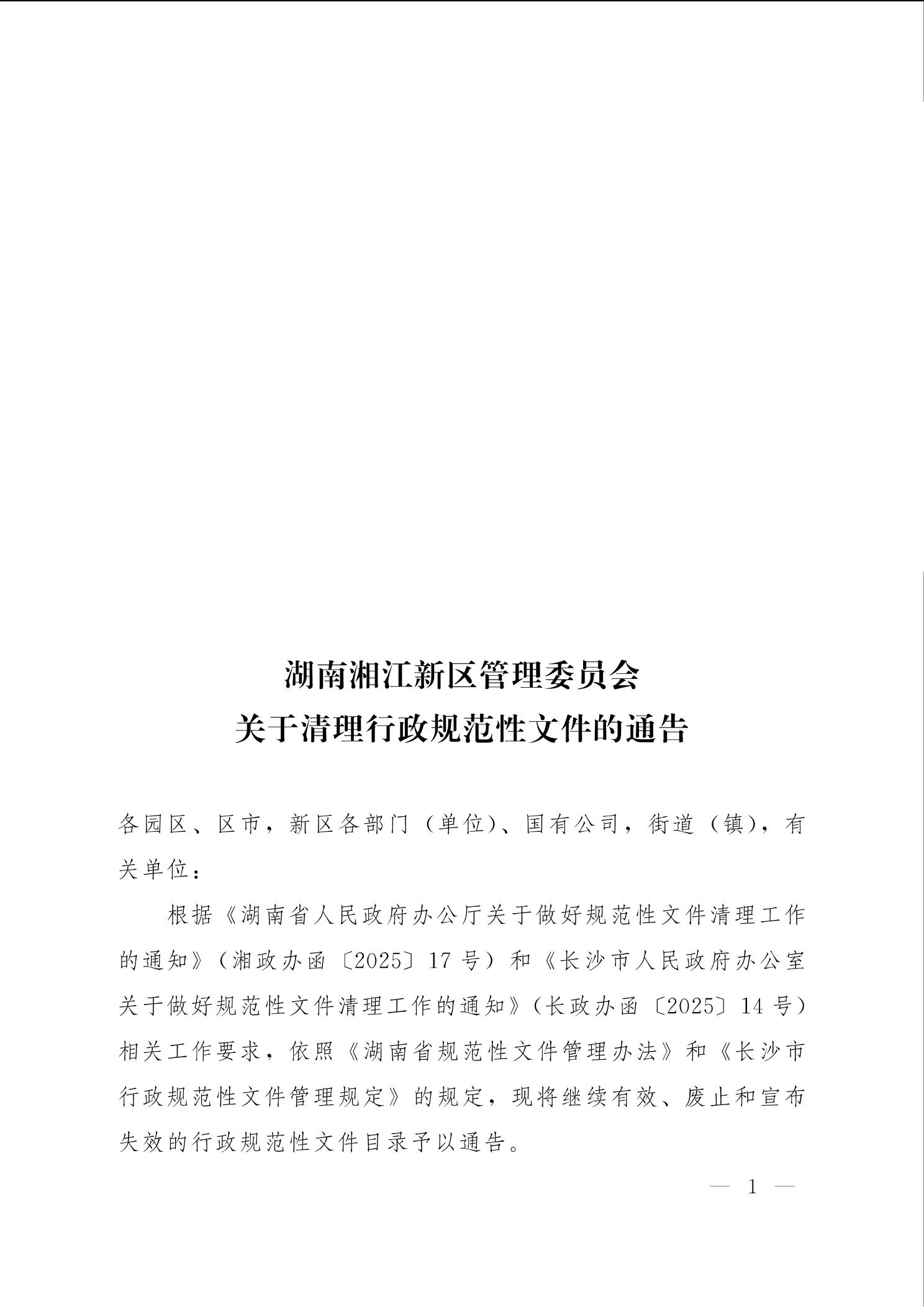 湖南湘江新區管理委員會關于清理行政規范性文件的通告