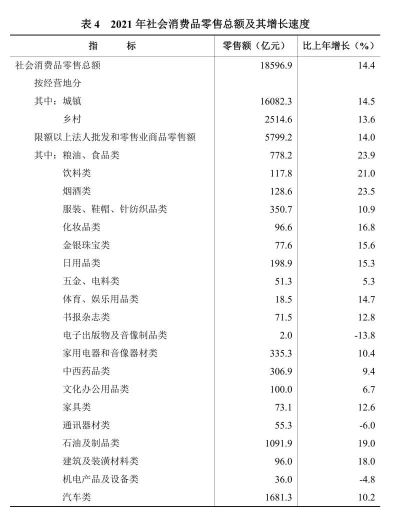全年限額以上法人批發和零售業商品零售額5799.2億元,比上年增長14.0%。分商品類別看,糧油、食品類零售額增長23.9%,化妝品類增長16.8%,家用電器和音像器材類增長10.4%,中西藥品類增長9.4%,通訊器材類下降6.0%,石油及制品類增長19.0%,汽車類增長10.2%。綠色智能商品中,可穿戴智能設備零售額增長18.5%,智能手機增長17.6%,新能源汽車增長61.9%。