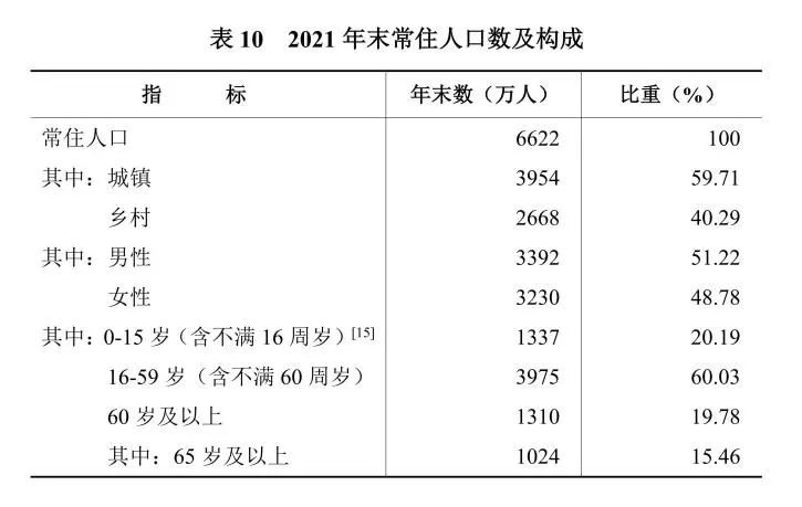 年末全省常住人口6622萬人。其中,城鎮人口3954萬人,城鎮化率59.71%,比上年末提高0.95個百分點。全年出生人口47.3萬人,出生率7.13‰;死亡人口54.93萬人,死亡率8.28‰;人口自然增長率-1.15‰。0—15歲(含不滿16周歲)人口占常住人口的比重為20.19%,下降0.56個百分點;16—59歲(含不滿60周歲)人口比重為60.03%,提高0.65個百分點;60歲及以上人口比重為19.78%,下降0.10個百分點。
